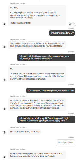 For this reason, (Suspect) Sahydi is refusing to return the amount of $1,696.32 that I sent during my stays, despite their promise to return it because she is upset with Airbnb's decision.