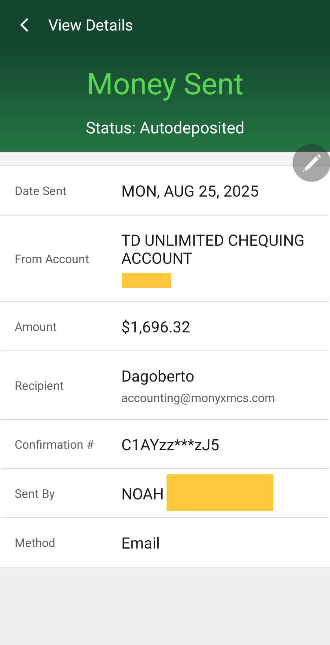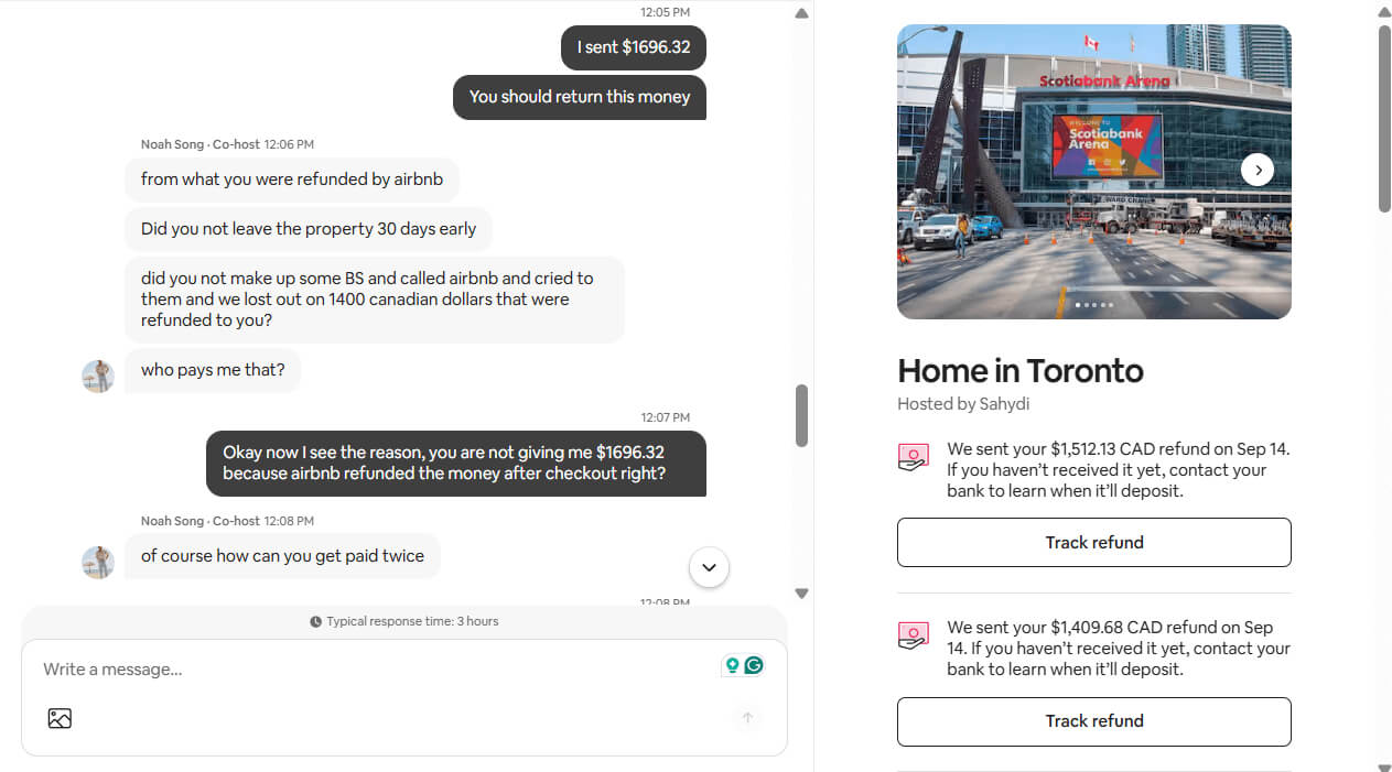 (Suspect) Sahydi was unhappy with this partial refund and is now refusing to return the $1,696.32 CAD that I sent during my stay. She claims that my refund from Airbnb is the reason for their refusal, but the refund I received from Airbnb is only for the unspent nights and is unrelated to the amount I sent during my stay.